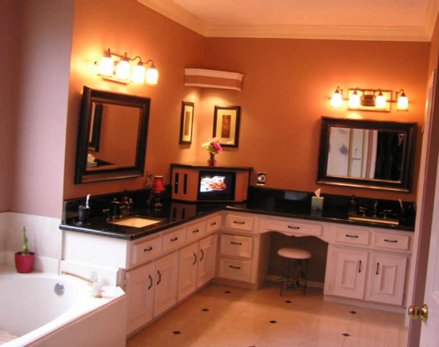 The completed project. New vanities, fixtures, lights, mirrors and paint. Door and drawer hardware compliments the finish on the light fixtures and faucets.