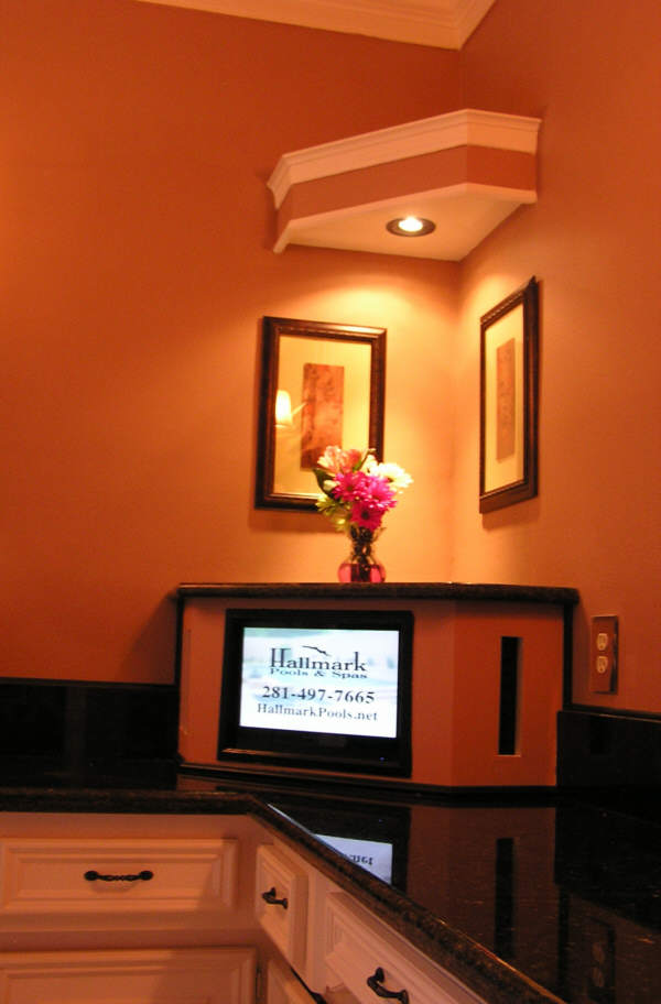 To simplify installation, the TV cabinet was placed on top of the vanity granite. The backsplash