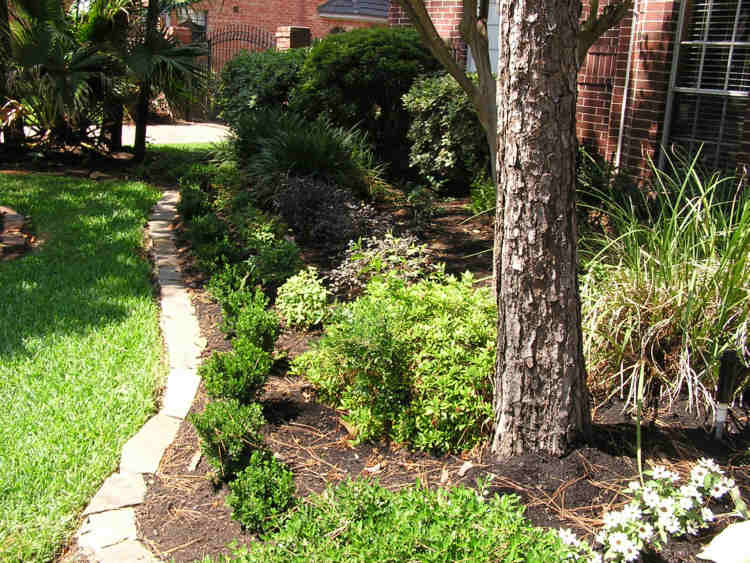 Retaining wall built and soil level raised. Plantings are the same as the right side with the addition of a 5th row of Foxwood Ferns for the deepest shade area.