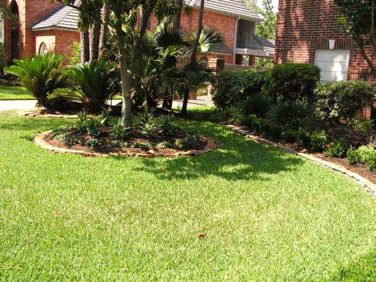 Overview of left side. Because the shade is more persistent here, the circular bed was planted with Ajuga Bronze (outer ring); and Dieffenbachia (inner ring).