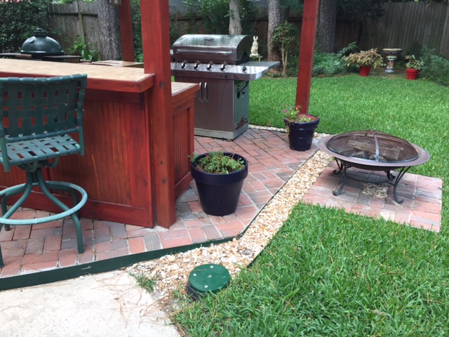 Water flows from the patio into the channel and the below-grade pump (under the green disc). A line from the pump rests within the channel