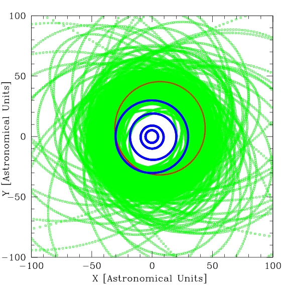The discovery of UB313, later named Eris(See Note 3), prompted scientists to approach the International Astronomical Union (IAU) to define the term 'planet'. If Eris was simply an 'object' in the Solar System, and larger than Pluto, then logically Pluto should also be classified as such. In 2006, the IAU issued 'Resolution 5: Definition Of A Planet In The Solar System'. In order to be a 'planet', a celestial body: (A) is in orbit around the Sun, (B) has sufficient mass to assume a round shape, and (C) have sufficient mass to assume a near sperical shape. Because Pluto had not cleared other objects from its orbit in the Kuiper Belt, it was reclassified as a 'dwarf planet', as defined in the IAU resolution. To add insult to injury, the IAU Minor Planet Center quickly assigned Pluto a number just as they do for a run-of-the-mill asteroid. Pluto, once the ninth planet, is now object # 134430. [7] 'Dwarf planet' is a somewhat paradoxical term, though considering the outcry from the general public over the Pluto controversy, that term may have been used to recognize that 'planet' is not only a scientific term, but a social construct, much like the term 'continent', for which there is no official definition. Why not simply call dwarf planets TNO's? It turns out that our Solar System is not the neat and tidy place we all grew up thinking. Besides the eight planets, Asteroid Belt and Kuiper belt (See Note 4), there are all sorts of rocks, dust and comets whizzing chaotically through the system. The Asteroid belt, the Kuiper belt, and the Oort Cloud (See Note 5) are considered reservoirs for the flotsam-and- jetsam leftover from the formation of the Solar system; each containing thousands if not millions of objects. Ceres' location in the Asteroid Belt prevents it from being called a TNO, and is now classified as a dwarf planet. | ||||||||||||||||||||||||||||||||||||||||||||||||