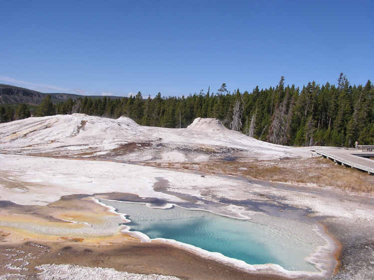 The hot spring in the foreground feeds the cascade in the previous slide. In the background are 'castle' geysers, named after the sinter cones that build up around the vent.