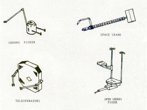 The space-suited astroworker, floating amongst the structural framework of orbital facilities will remain a familiar sight for decades to come. Rather than replacing man in space, this support equipment will aid him in thre distinct ways: (1) provide greater torques and larger forces at greater reaches, (2) provide stability to a structure to prevent tumbling about one or more axis, (3) replace man during periods of high radiation flux. The use of these remotely operated cranes and manipulators will bring about the formation of a new class of astroworker -- the teleoperator technician -- skilled in operatiing cranes, cherry pickers or manipulators from a remote location in the Space Station or he Shuttle; or from a remote workstation of a construction platform. Data from a sophisticated system of video, lighting and instrumentation will be all the feedback the operator will have to control activities that may be a kilometer away.