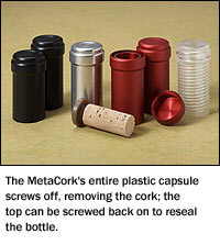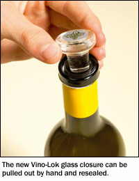 Metacork is a new technology that combines traditional cork with screw-caps, often referred to as a 'twist capsule'. The unique design has a built-in cork anchor that allows you to remove a cork or synthetic stopper with nothing more than a few twists of the capsule. Another twist on non-cork closure comes from Australian inventor Conor McKenna, called the ZORK. It is similar to a crew cap in the way it seals and it is made of material that won't taint the wine. The ZORK snaps on to the glass band found on traditional wine bottles. Once the aluminum seal is broken, a plunger is pulled out by hand, making that satisfying "pop." The plunger, which is similar to those used on inexpensive Ports, allows the bottle to be resealed after opening. The Alcoa Company has taken this concept a step further by creating a completely inactive glass stopper to reseal the wine. The product called Vino-Lok, is made of glass and fits into a wine bottle the way a decanter stopper does. |