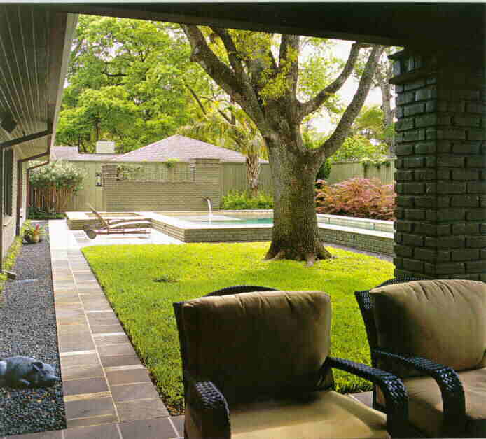 masonry wall at the far end to serve as a backdrop for a simple fountain that adds motion and sound." By controlling the water volume flowing from the fountain, the sound can be changed from a high-pitched trickle to a deep, throaty rush of water.