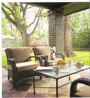 McKinnon, an accomplished gardener as well as landscape designer, says that every plant selection was made with a specific purpose in mind, "for silhoutte, for contrast in texture, or for underscoring the structure of the garden. The composition is deliberatelt minimal, not layer upon layer, or texture upon texture, but with a simplicity that helps acheive the goal of a peaceful, comforting sanctuary. The concept of minimalism seems a litte Viewed from the covered patio, the rear yard (above) is a study in linear geometry. The masonry wall in the background conceals equipment for the pool, spa and fountain. The floor tiles used in the covered patio (left) extend to the pool and pet areas to seamlessly tie all functional zones into the whole. |