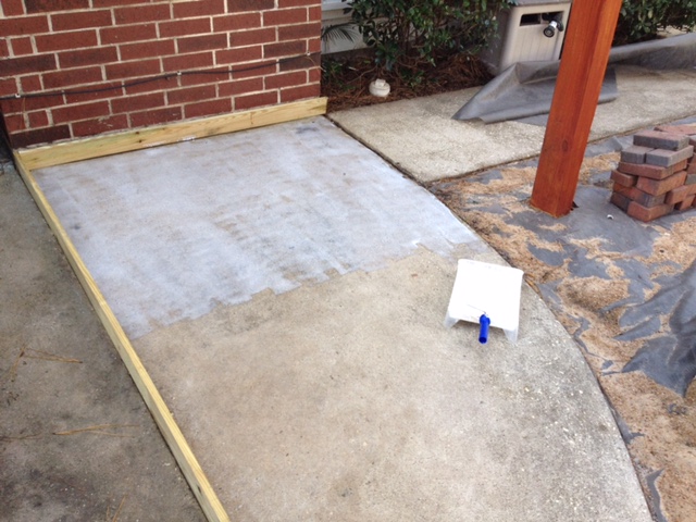 After etching existing concrete with acid, a product is applied to help mortar adhere
