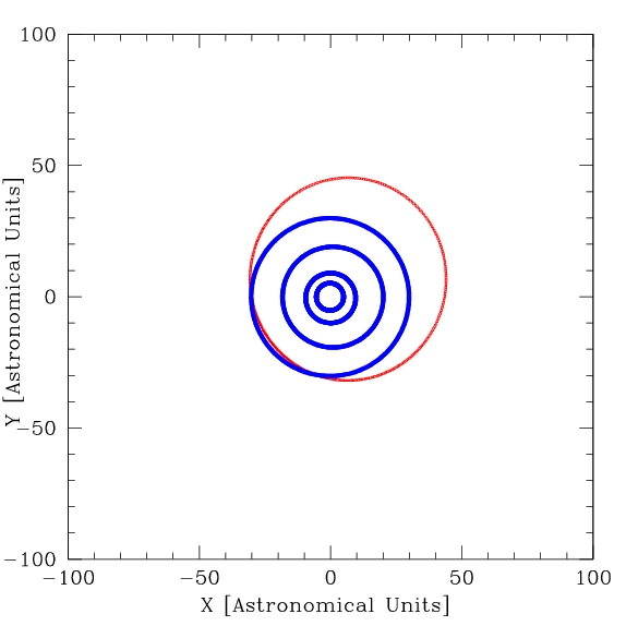 Now let's fast forward to the end of the twentieth century. Except for Pluto, robotic spacecraft have explored all the major planets and their satellites. By this time our knowledge of Pluto and the Solar System in general had changed dramatically. Pluto, at 2,300 kilometers in diameter, proved to be much smaller than expected , and its mass was six times less than Earth's Moon. Its orbit was highly tilted from the plane of the ecliptic (See Note 1), and it's axis inclined at 122°. In short, Pluto didn't behave like the other planets, and at one point in its orbit was closer to the Sun than Neptune – that is, it actually crossed Neptune's orbit. The only objects known to cross planet orbits were asteroids and comets. Scientific eyebrows were slowly being raised when discussions turned to Pluto planetary status.