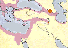 The colored area shows how far vinifera had spread by Ancient Greek times.   The colored circle indicates what most experts agree is the birthplace of V. vinifera