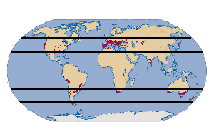 The narrow bands between the dark lines represent the regions where vinifera thrives, between 30 and 50 degrees latitude. The red areas indicates today's major winegrowng regions